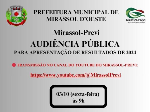 O Mirassol-Previ, em parceria com a Prefeitura Municipal de Mirassol d’Oeste, convida toda a sociedade a acompanhar a Audiência Pública para apresentação dos resultados referentes ao exercício de 2024.